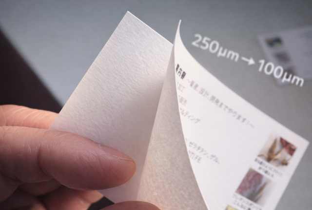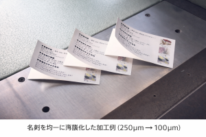 一般的な名刺(250μm)を100μmまで均一にスライスする加工を実現しています。