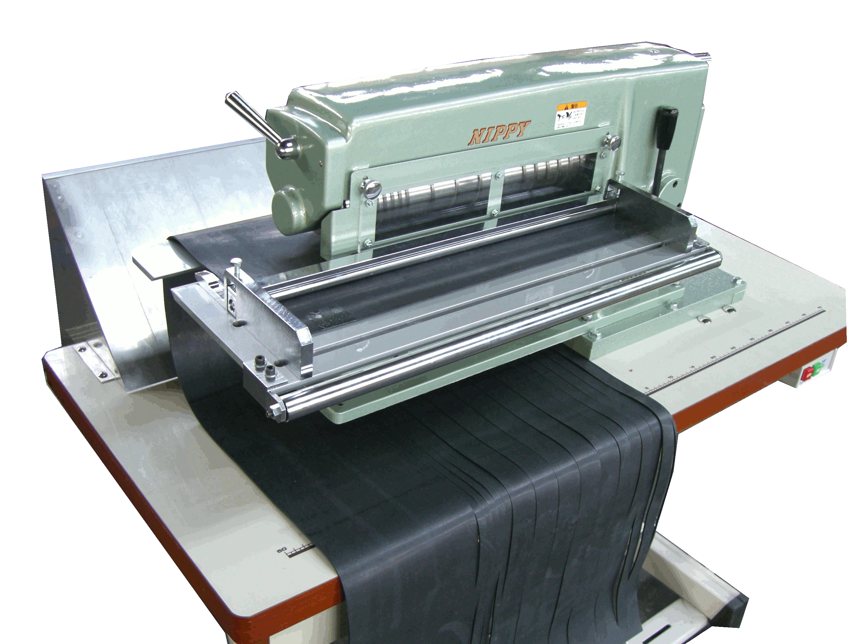 一般的にスリッターや裁断機と呼ばれ、任意の寸法に丸刃を使用し幅を裁断スリッターする機械です。幅寸法ごとに座金をセットし、丸刃により皮革製品、ゴム、ウレタン、フェルト、スポンジ、発泡体、その他様々な軟素材をスリットします。